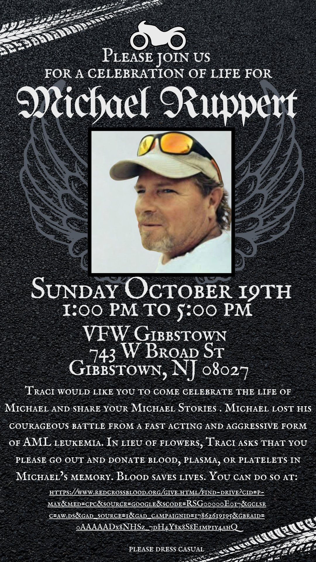 The Celebration of Life For Mike Ruppert has been arranged.The event will take place on October 19th at the VFW in Gibbstown NJ from 1-5pm.